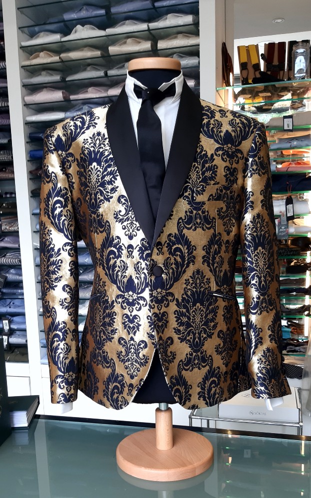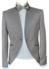Le giacche in broccato sono coordinate a pantaloni in tinta unita, di solito in cadì di seta.